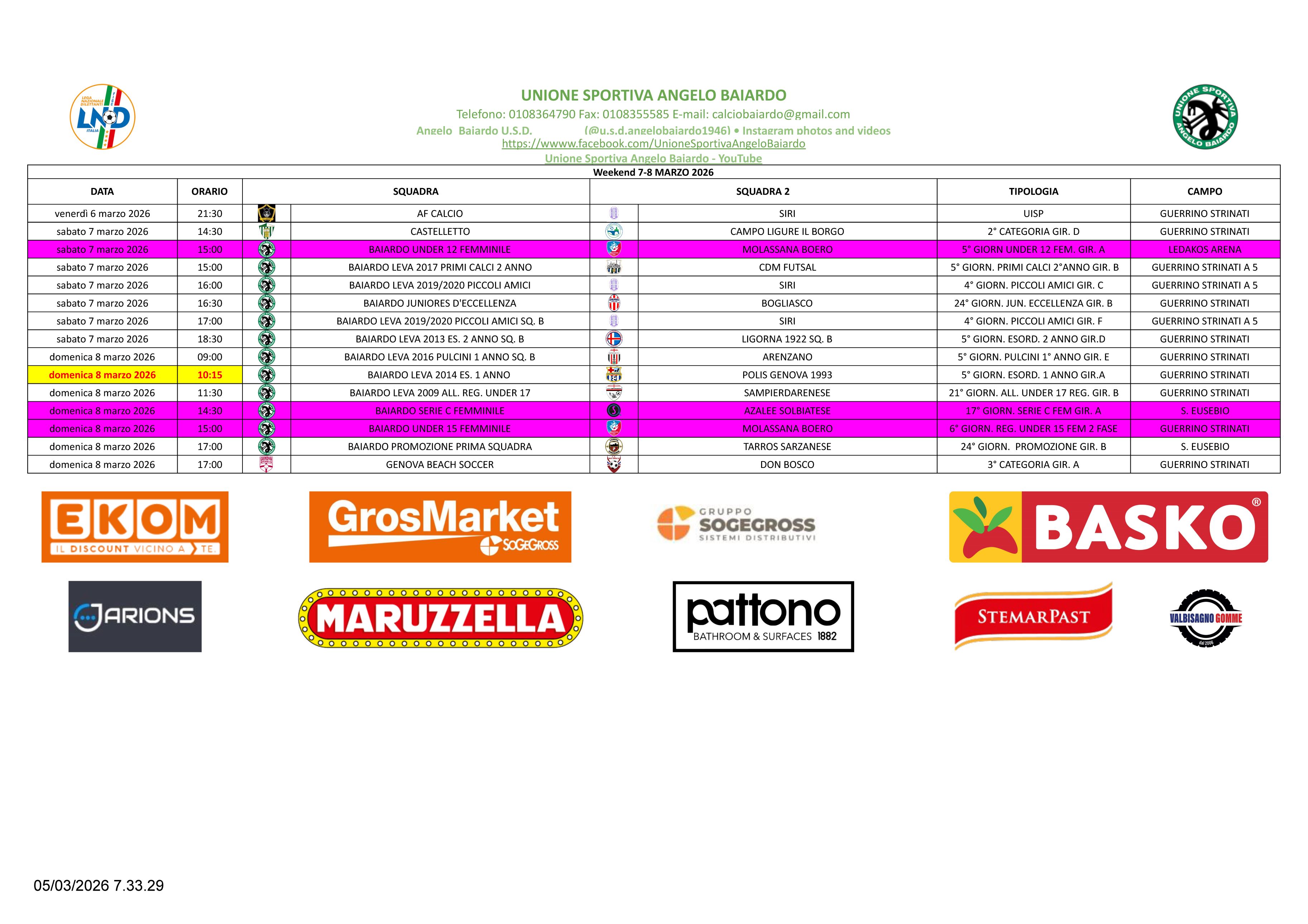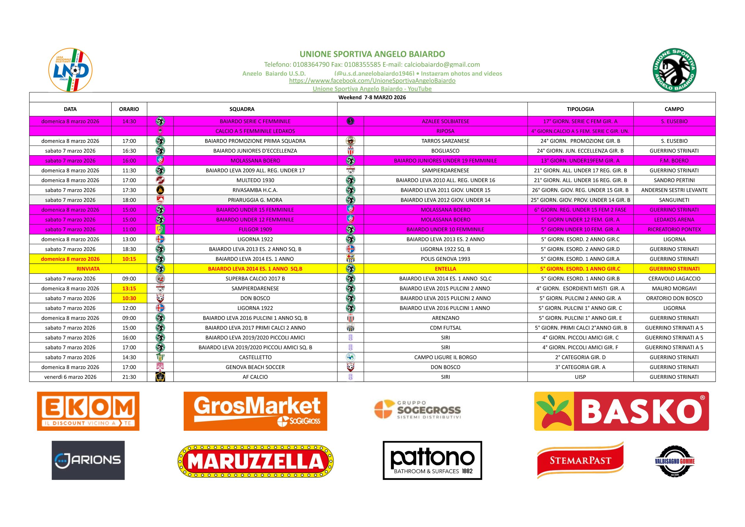LE PARTITE IN PROGRAMMA DEL PROSSIMO WEEKEND 7 - 8 MARZO 2026