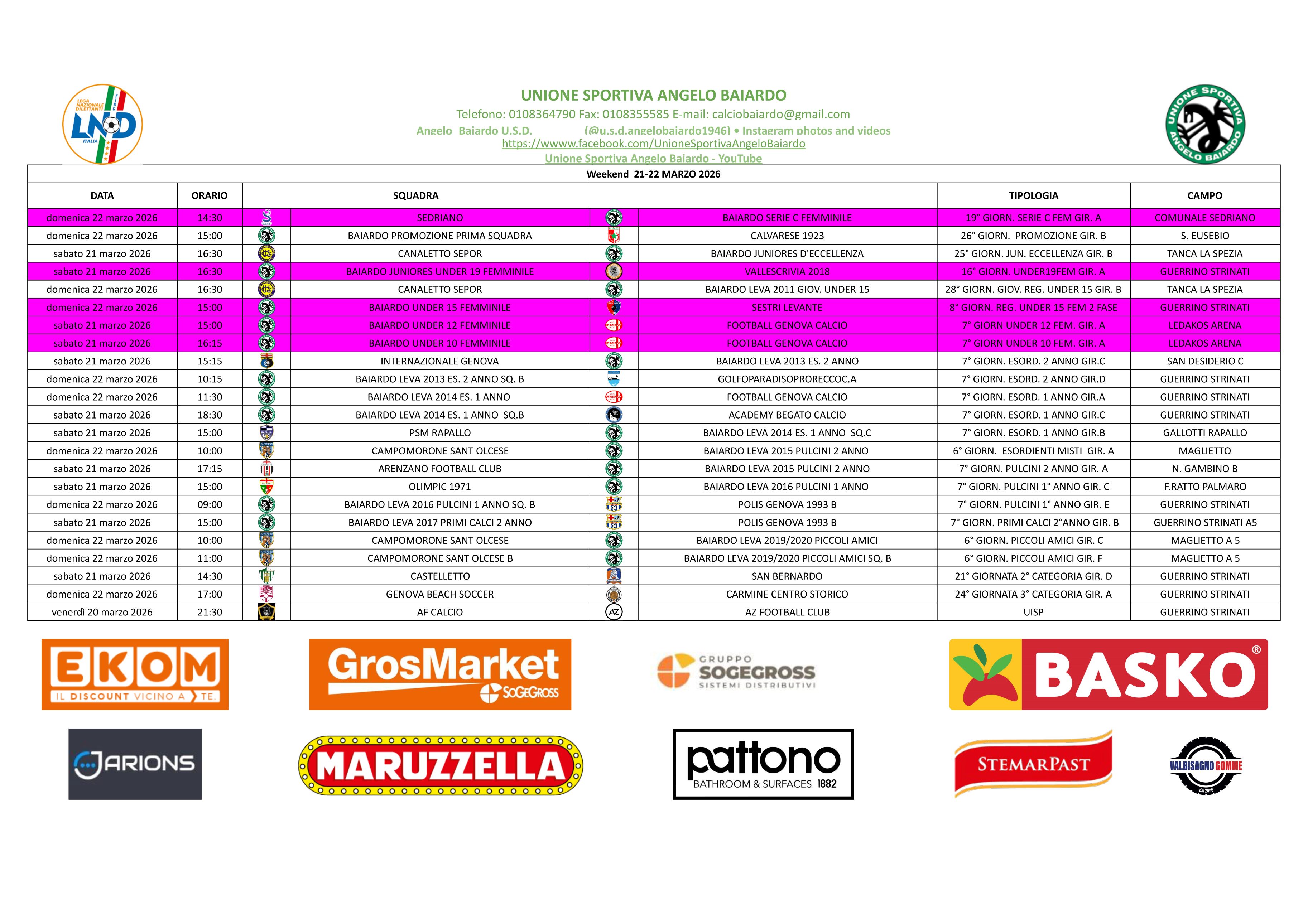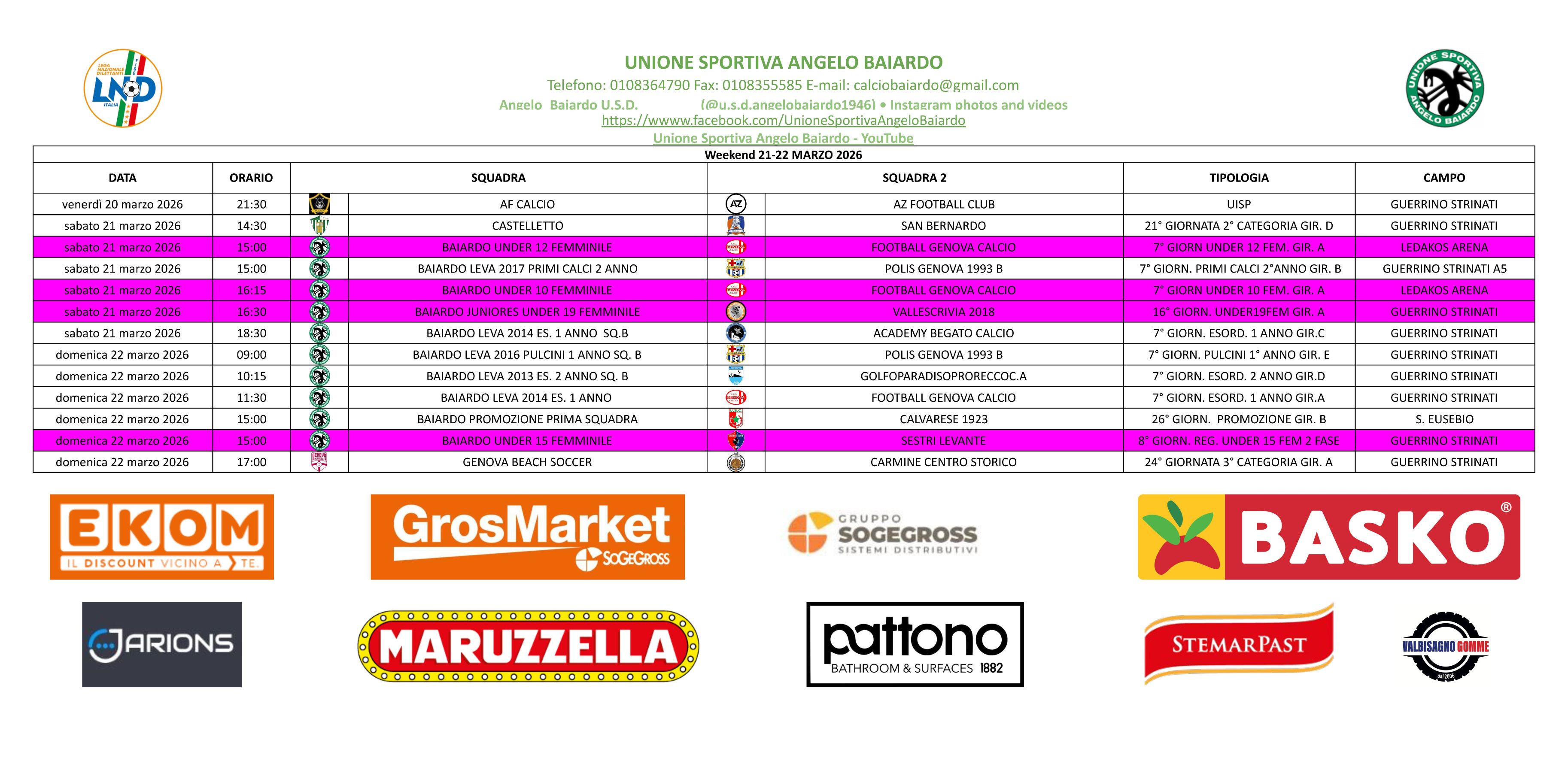 LE PARTITE IN PROGRAMMA DEL PROSSIMO WEEKEND 21 - 22 MARZO 2026