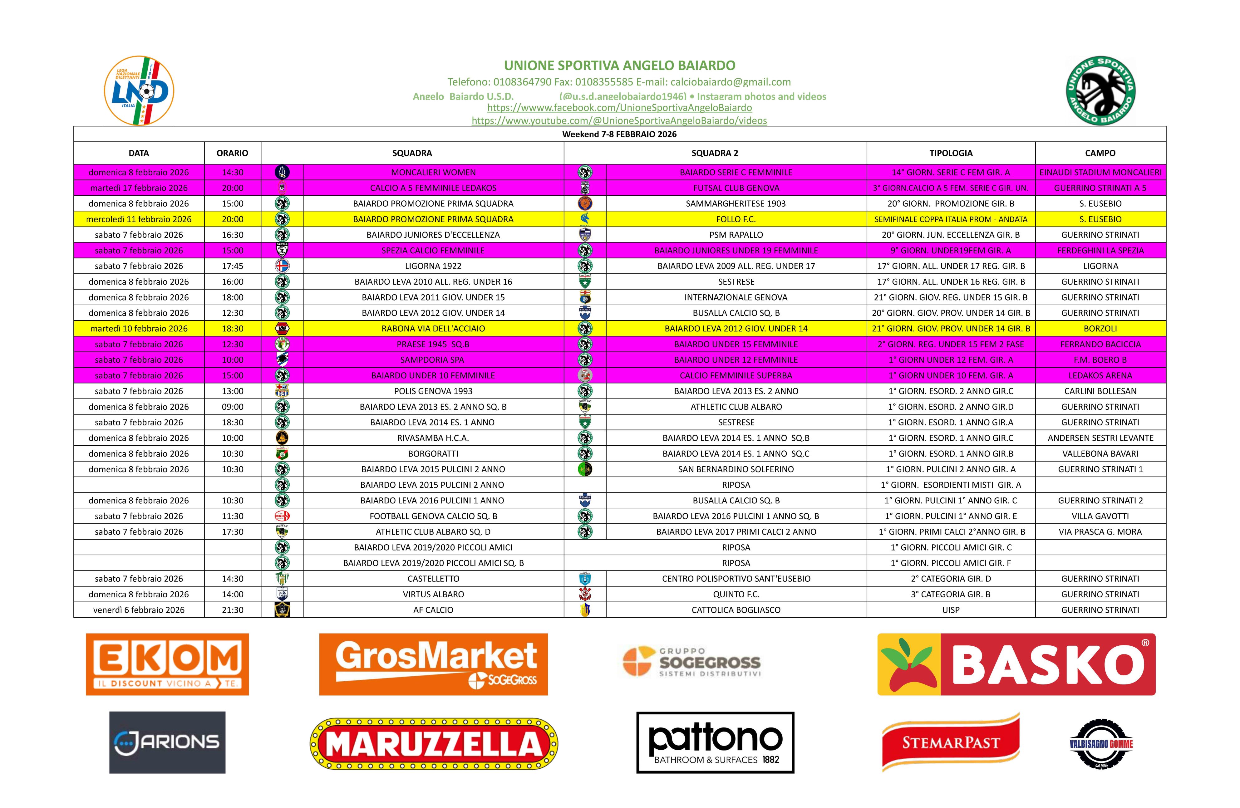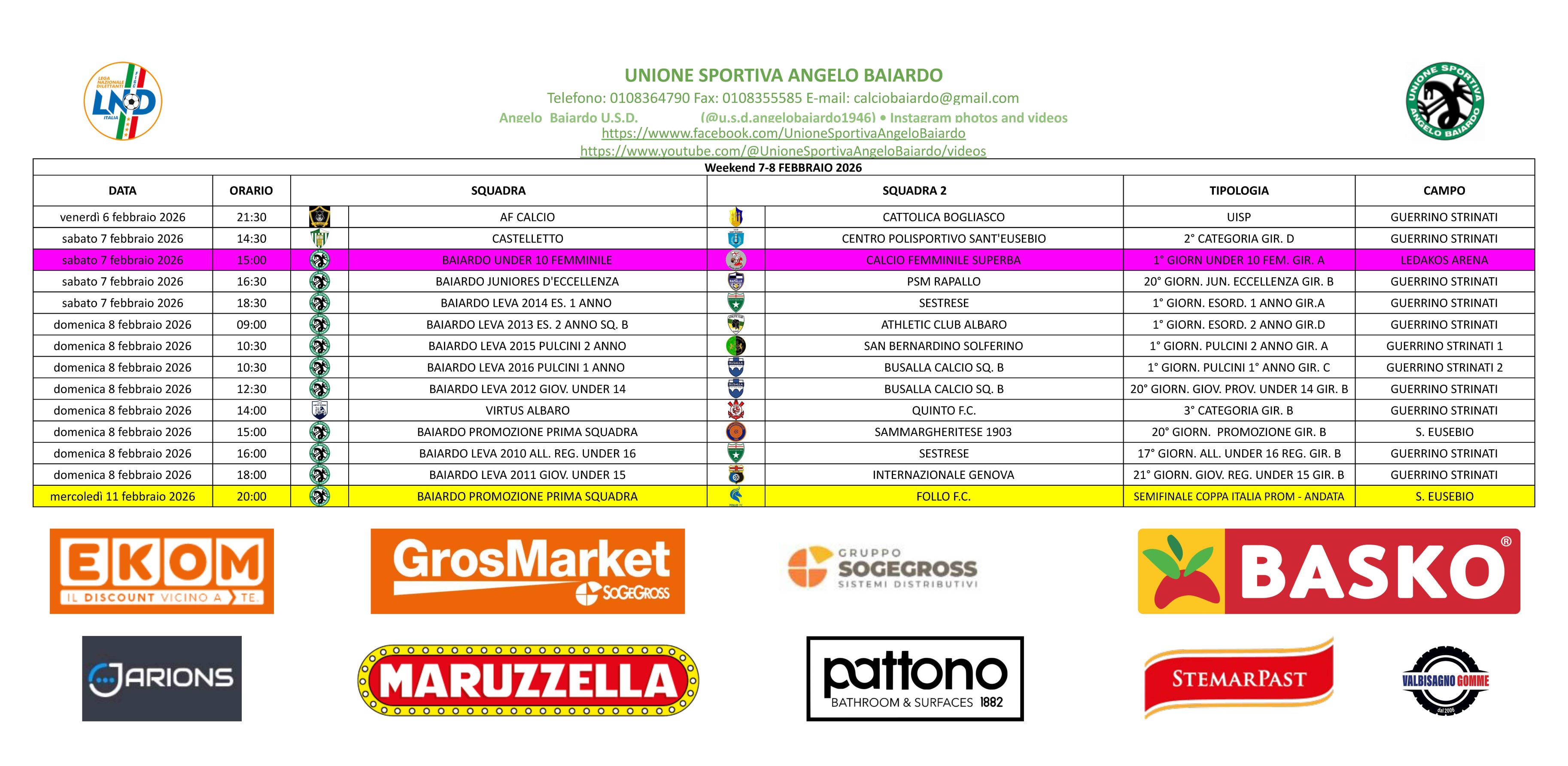 LE PARTITE IN PROGRAMMA DEL PROSSIMO WEEKEND 7-8 FEBBRAIO 2026