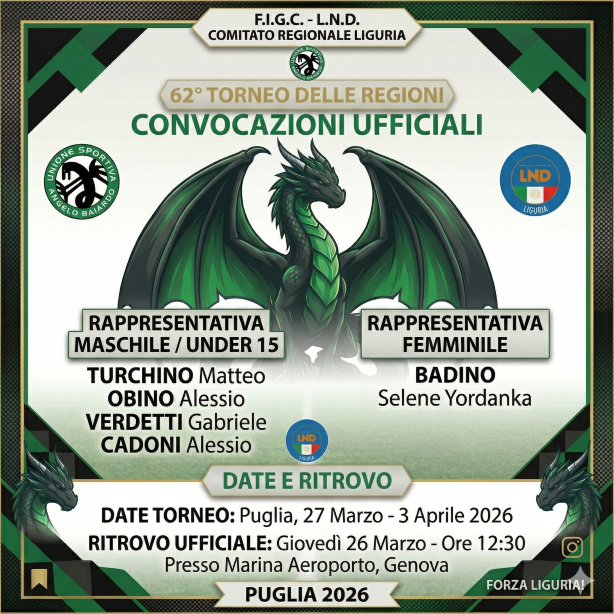 ⚫🟢🐉 COMPLIMENTI e un grosso in bocca al lupo ai nostri draghetti e alle nostre draghette, che oggi hanno risposto alla chiamata delle rispettive Rappresentantive Liguri, per partecipare alla 62a edizione del "Torneo delle Regioni" ⚫🟢🐉